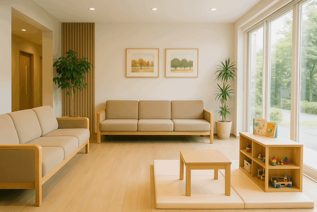 大きな窓から自然光が入り、観葉植物と落ち着いた色合いのソファが、「病院らしさ」を感じさせない穏やかな雰囲気をつくります。